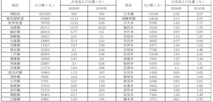 根据酉阳县第七次全国人口普查结果,现将2020年11月1日零时我县39个乡镇(街道)的常住人口[2]有关数据公布如下: