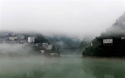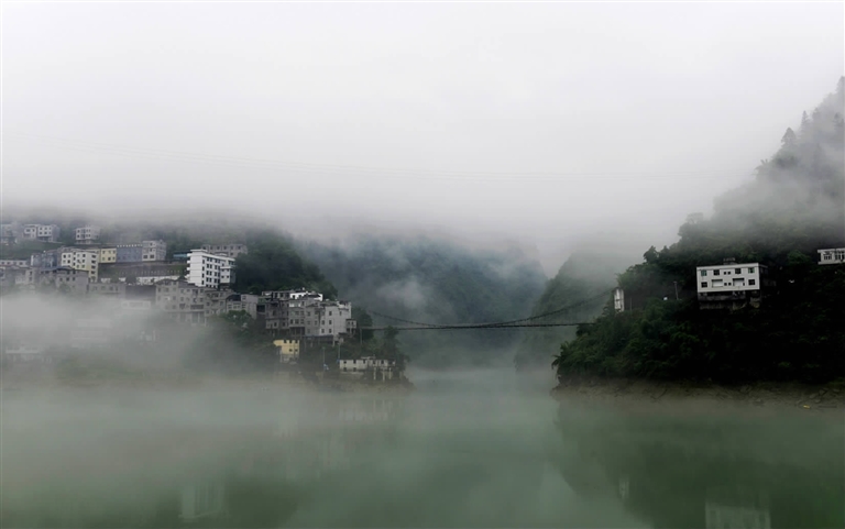 当日,罾潭村大雨滂沱,村寨、山峦、江水、吊桥、远山在云雾中若隐若现,宛若仙境。