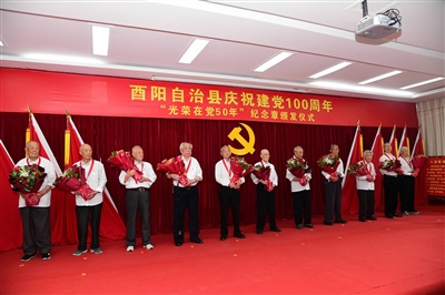 在认真听取3名党员代表发言后,祁美文指出,颁发“光荣在党50年”纪念章,充分体现了以习近平同志为核心的党中央对老党员的亲切关怀和极大褒奖,大家倍感自豪,我们也备受鼓舞。因为老党员的奉献牺牲,我们有了好日子;因为老党员的立党为公,我们有了好榜样;因为老党员的高风亮节,我们有了好传统;因为老党员的示范表率,我们有了好环境。老党员政治坚定、忠诚爱党、为民服务,为推动酉阳撕掉绝对贫困标签起到重大作用,各位老党员是酉阳高质量发展的宝贵财富和强大依靠。