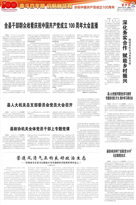 “习近平总书记的讲话掷地有声、催人奋进,让我心潮澎湃,备受鼓舞!”县政协机关工作人员表示,将加强对党史的学习,更加坚定理想信念,同时继续主动深入联系界别群众,倾听民声、反映民意,为党委、政府决策提供参考。