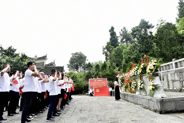 6月29日,县桃花源旅投集团公司全体党员在南腰界红三军司令部旧址开展“学党史、感党恩、听党话、跟党走”主题学习活动,缅怀革命先烈,重温入党誓词,学习党的发展历史,迎接中国共产党成立100周年。