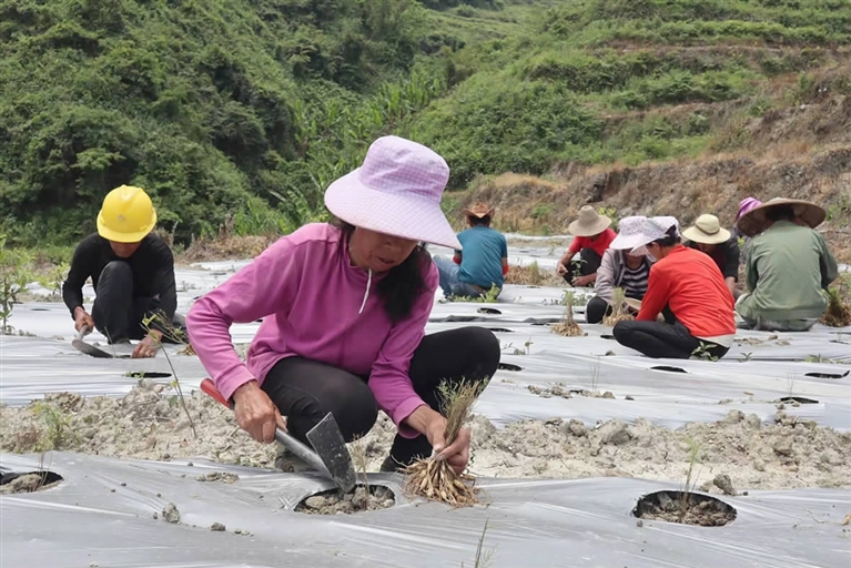 5月6日,初夏的阳光温暖地洒向大地,在麻旺镇龙坝村6组半山腰的一片油茶基地里,20多名村民正抢抓时节,在油茶树下套种天冬。