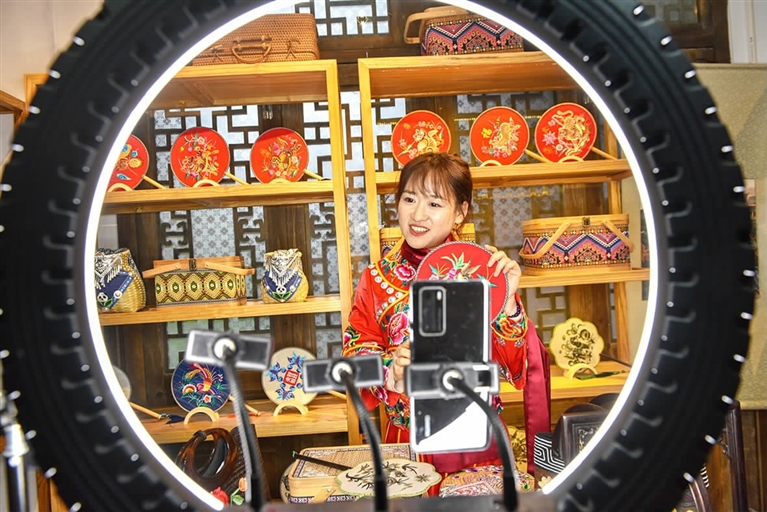 入夏以来,非遗苗绣文创产品进入产销旺季,酉州古城非遗苗绣制作工坊在线下拓展销售渠道的同时,还通过网络直播的方式推介销售挂画、摇扇、传统苗族服饰等文创产品,具有浓郁民族和地域特色的文创产品深受消费者青睐。