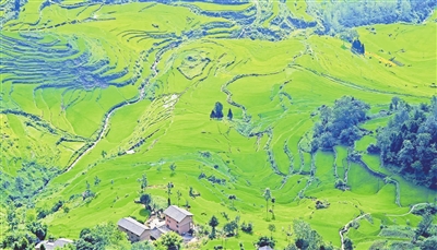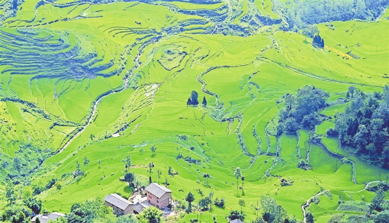 近日,在花田乡何家岩村,清风拂过,层层梯田泛起千重绿浪。