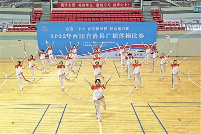 9月29日,由县体育发展中心主办,以“喜迎二十大·奋进新征程·建功新时代”为主题的广播体操比赛举行决赛,来自县民族小学、酉州小学、大溪镇、交通局等单位的8支队伍参加。 融媒体中心记者白凤英摄