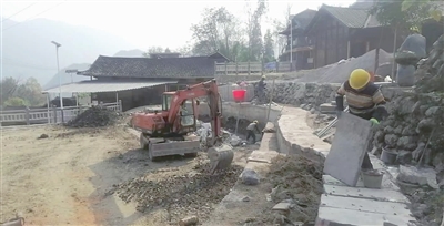 沿着铺好的石板路拾级而下,随处可见忙碌的施工场面。