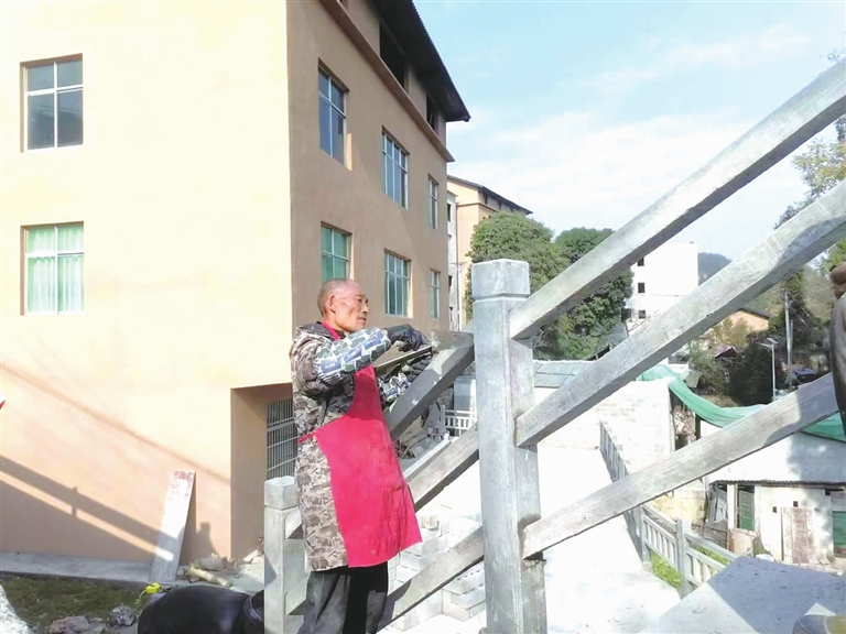在便民路改造现场,70岁老党员冉景杨正在和砂浆,长满老茧的双手紧握铲子,经过无数次的上下翻转,沙子和水泥便混合在一起,成为石板与路面的黏合剂。