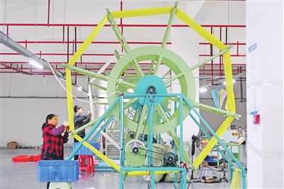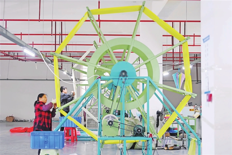 近段时间,位于县工业园区板溪组团的悦鹏伞业有限公司生产车间内机械轰鸣,打基眼、裁片……随着雨季到来,100多名工人正加班加点赶制雨伞订单。