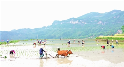 在花田乡何家岩村,水田成了“战场”:有的牵着黄牛犁田,你追我赶;有的手握嫩绿秧苗,快速分秧插秧,动作行云流水;围在田埂边的群众则卖力地为选手们鼓劲助威,现场一片热火朝天的景象。