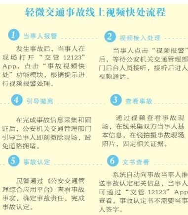 据介绍,轻微交通事故线上视频快处方式是:当事人发生轻微交通事故后,可以直接通过“交管12123”App中“事故视频快处”模块进行报警,民警通过系统后台直接用视频与当事人进行线上操作,引导当事人完成事故信息的采集、固证等工作,当事人撤离现场后系统将远程推送责任认定,实现轻微交通事故快速撤除现场,减少交通拥堵的效果。