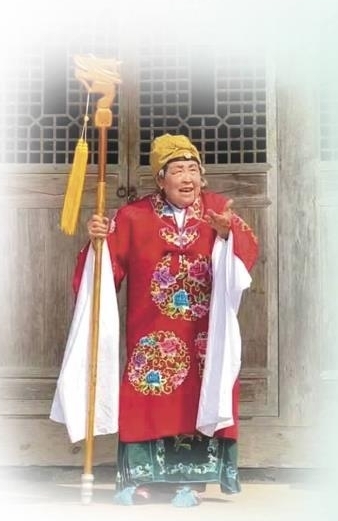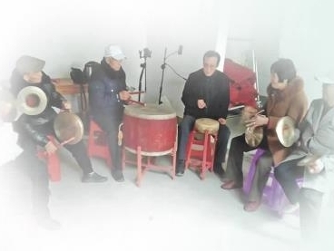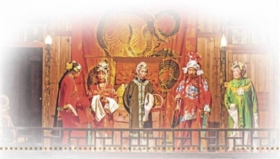 古戏台上,正中放置一张木桌,两把铺着红布的太师椅分列两旁,木桌背面悬挂着一幅巨大的祥云图。右侧是文场面,3位琴师手拿二胡、琵琶、胡琴等乐器;左侧是武场面,4位鼓师手拿锣鼓、钹等乐器,随着一声鼓点响起,锣鼓响板,粉墨登场,击节哼唱,节奏分明。