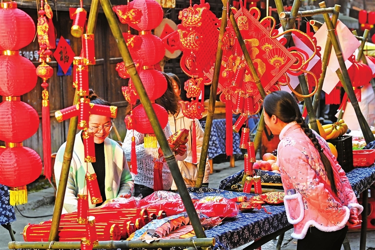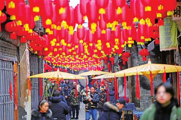 1月28日,龙潭古镇各条街巷大红灯笼高高挂,千年古镇沉浸在一片热闹而繁忙的氛围中,年味越来越浓。