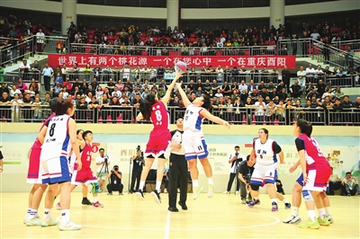 5月21日晚,2024年成渝地区双城经济圈篮球对抗赛暨中国酉阳武陵山片区“酉阳茶油”杯篮球邀请赛在县体育馆开赛。 特约通讯员陈碧生摄