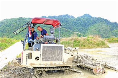 “如需改变行走方向,可通过手动转向手柄或操作遥控器按钮……”日前,在杉岭村2组的高标准农田里,重庆市田中秧农业科技股份合作社负责人杨贤平正在教导重庆机电职业技术大学学生李松玲如何操纵自走式履带旋耕机(如图)。