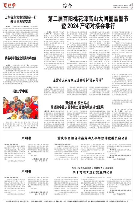 本报讯 (融媒体中心见习记者刘 尊) 金秋十月,稻美蟹肥。10月23日,由县农业农村委、商务委、文旅委主办的第二届酉阳桃花源高山大闸蟹品蟹节暨2024产销对接会在板桥乡举行,来自全国各地的10余家采购单位参加。