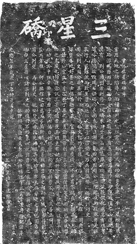 从1875年农历十月上报,到1877年农历五月竣工,虽然经历了将近三年时间,但实际修桥只用了半年。为纪念对该项工程给予支持的知州周锡龄、马玉堂、姚文浚,建桥的绅民将过路潭桥命名为“三星桥”。同时,负责工程的冉隆纪也写下了《重修三星桥碑序》。