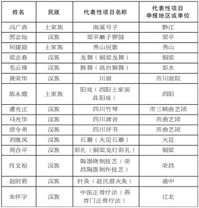 3月17日,文化和旅游部公布第六批国家级非物质文化遗产代表性传承人名单,共计942人上榜,其中15位来自重庆的代表性传承人入选。其所覆盖的非遗项目包括龙舞、狮舞、川剧、梁平癞子锣鼓、大足石雕等。截至目前,重庆共有74人入选国家级非遗代表性传承人名单。