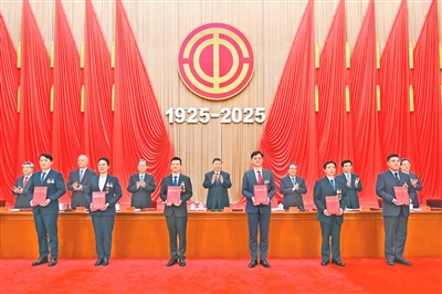人民大会堂大礼堂气氛隆重热烈。主席台上方悬挂着“庆祝中华全国总工会成立100周年暨全国劳动模范和先进工作者表彰大会”会标,后幕正中悬挂中国工会会徽,会徽下方是“1925-2025”字标,10面红旗分列两侧。二楼眺台悬挂着标语:“以习近平新时代中国特色社会主义思想为指导,坚定不移听党话跟党走,在以中国式现代化全面推进强国建设、民族复兴伟业中充分发挥工人阶级主力军作用和工会桥梁纽带作用!”