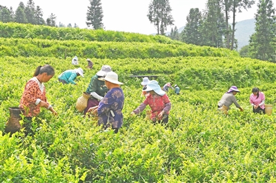 8月6日,木叶乡梨耳村藤茶基地内,村民们正忙着采摘鲜叶,一派繁忙景象。