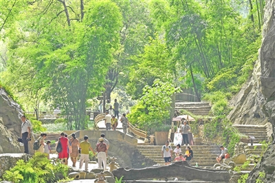 近日,游客和市民在酉阳桃花源景区游玩,乐享清凉。