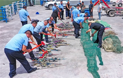 据统计,此次联合执法行动全程巡航132公里,出动执法人员52人,船艇6艘,车辆6辆;累计检查船只72艘,依法暂扣“三无”船舶3艘;清理违规渔具6张,立案查处2起;检查垂钓人员45人次、查处违规垂钓行为5起,收缴暂扣钓具33支。缴获的违规渔具用品在万足海事码头进行了集中销毁处理。