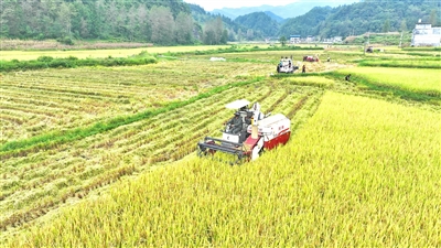9月6日,涂市镇麻田村,农机手驾驶收割机在田间收割水稻。涂市镇万亩优质水稻进入成熟收获季,农机手驾驶收割机在稻田中来回穿梭,抢抓晴好天气加紧收割,一派忙碌景象。近年来,酉阳大力推广高产优质水稻种植,指导种植户推广全程机械化作业,确保水稻丰产丰收,助力乡村振兴。
